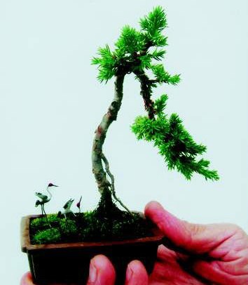 圖5 為了改變現狀,便把盆樹根部植入盆面的一側。并且按照“樹木種植于盆缽一側后如感到有偏重現象,可在盆缽另一端添加擺件,以求均衡”的原則,在另一側空白處放上一對仙鶴擺件。這樣調整后盡管畫面略有改觀,但還是顯得別扭、難看。