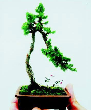 圖4 直干式盆景用盆不論什么形狀都不宜偏深,這株帶有俯枝的地柏被植于淺馬槽盆內是合適的,但問題在于種植位置被安排在長方形盆的正中央,不對稱的樹姿使盆樹重心愈加偏離了好位置,從而造成畫面呆板,缺少美感。