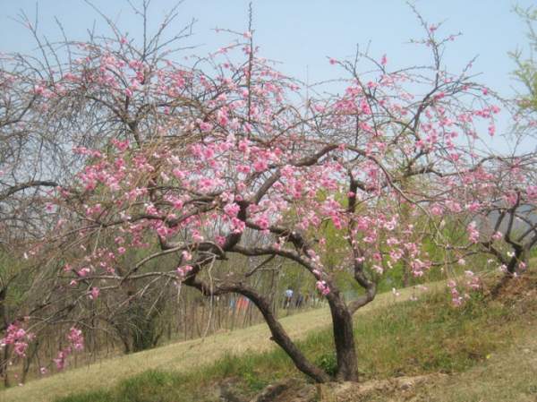 垂枝桃是桃花中枝姿最具韻味的一個類型,其小枝拱形下垂,樹冠猶如傘蓋。花開時節,宛如花簾一瀉而下,蔚為壯觀。無論是孤植于庭院,還是群植,都有很好的觀賞效果,可作為公園、小區等地的景觀樹或行道樹