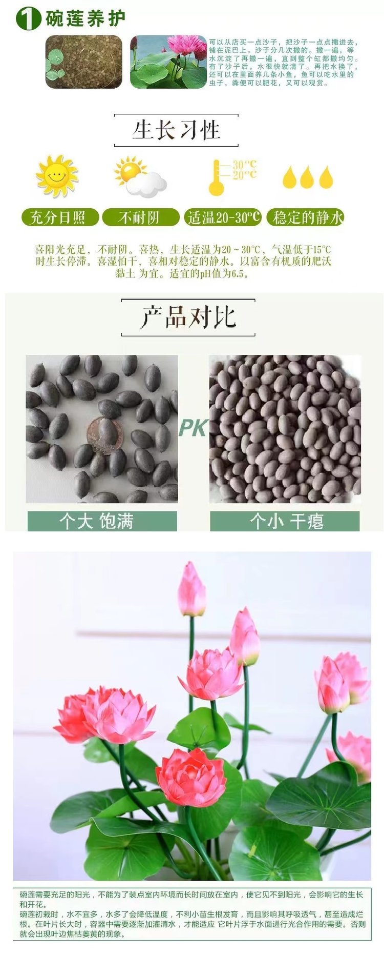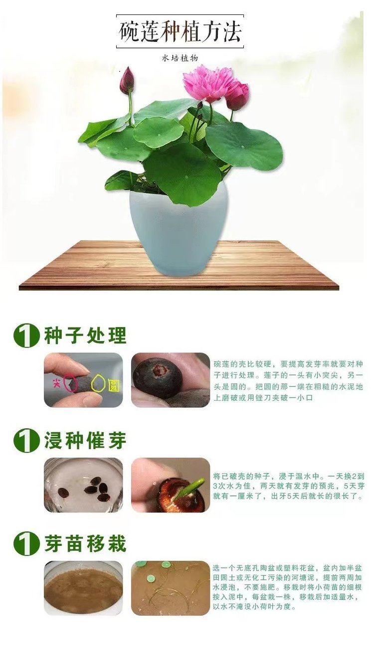 選擇健康、成熟的蓮花種子。成熟的種子會(huì)呈黑色或深褐色,并且具有完整的種皮和胚芽。準(zhǔn)備好種子后,將其浸泡在清水中,大概2-3天,每天更換水,直到種子表面的外殼軟化。