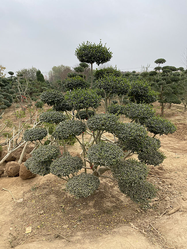 小葉女貞造型樹,看似簡單隨意的剪扎,每一株都凝聚師傅們的心血。即為景,一定有其獨特之處,每一株造型樹都不相同。這是盆景以奇、斜、怪、獨為美的追求,也是根據植物隨意生長的株型,而個性制作。多數為云片壯,一棵樹有8片以上,樹高從1.2~5米不等,樹干粗度不定。雖然經過特定造型,但是其本性沒變,還是小葉女貞,主要特定還是那樣,只是在養護管理上,需要定期修剪,殺蟲,管理工夫要大一點。