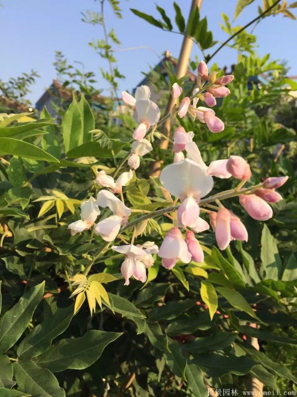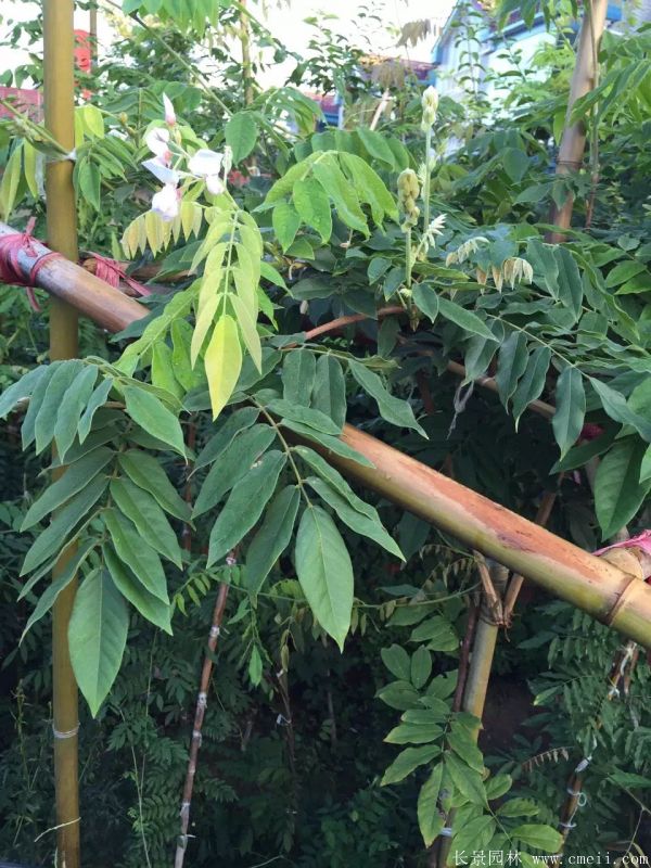 紫藤,植株高度0.6~2米高上下,葉子形狀按照品種有區別有差別,有一些較為細長,有一些接近橢圓,紫藤花朵色彩是增加,如桃紅,紅色,淡黃色,白色等,開花時間十分長,花量巨大,每年的是花開的時間時間段從6月下旬到8月,果實9~10月熟透,有較好的出芽水平。
