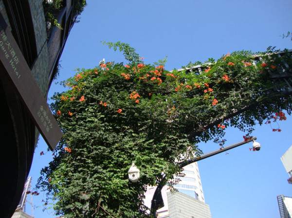 凌霄長勢非常快,應(yīng)用于棚架在較短的時間內(nèi)就能起到遮陰的作用,其紅花綠葉,是夏季一道亮麗的景觀,人們在棚下休憩,倍感清爽。