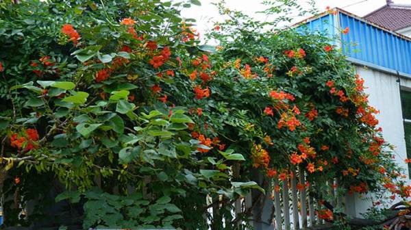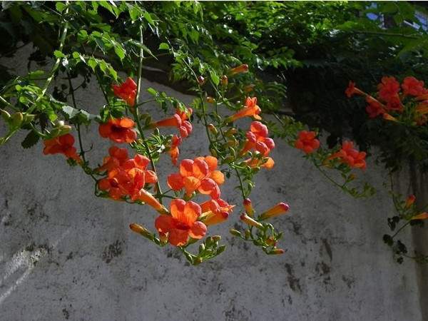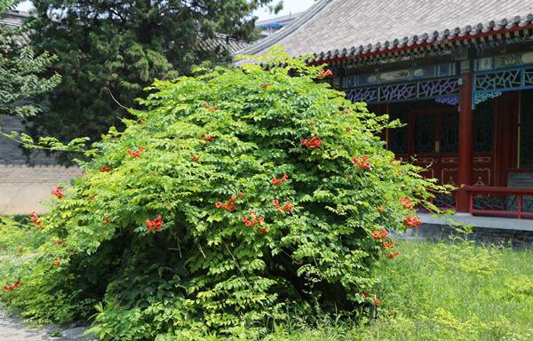 凌霄具有較強(qiáng)的攀援能力,將其栽植于建筑物的西山墻,幾年時間,便可爬滿墻體,不僅起到了綠化美化作用,還可有效降低夏季的室溫。花開之時,滿墻紅花,好似花瀑一般,隨風(fēng)搖曳,美輪美奐。